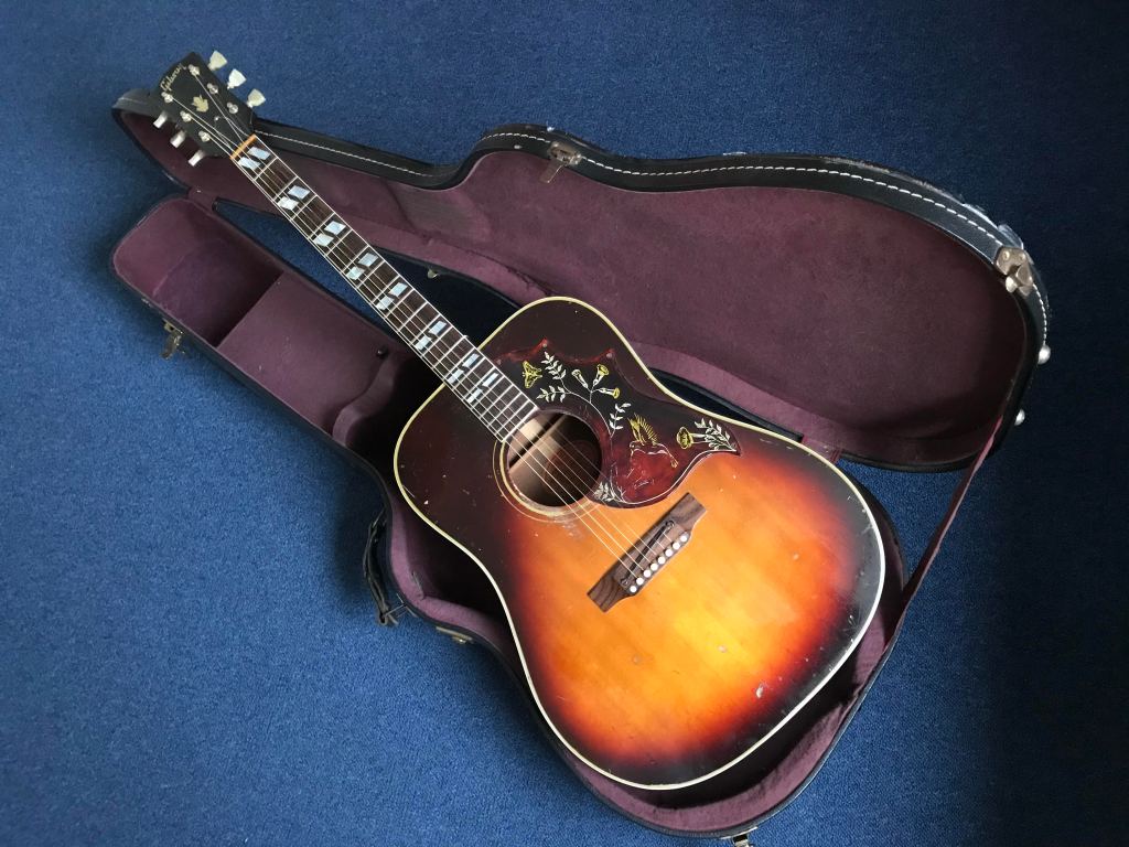 Ik had ’n behoorlijk bedrag geboden op deze red label, dark sunburst Gibson Hummingbird uit 1965. Met stevige playware, dents van decennia en zeker via diverse eigenaars van over zee gekomen. Het bleek een solide instrument met barstjes in de lak, zonder cracks in het hout en met een slagplaat die met schroefjes gemonteerd was. Dat het een toenmalige correcte bevestiging was, wist ik nog niet. Onlangs was er een goed werkend K&K element ingebouwd met een output naast de endpin. De sound beviel me, ondanks de oude snaren en de smalle nek. Ja, die wilde ik er wel graag bij hebben.