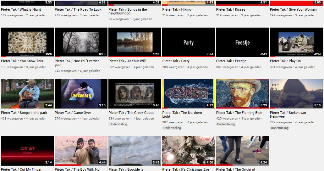 De afgelopen jaren bracht Pieter Tak een groot aantal songs uit op YouTube, voorzien van video. Een indruk hieronder.